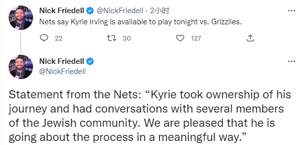 篮网官方确认欧文解除禁赛,可以出战今天与灰熊的比赛,篮网官方发表关于欧文的解禁声明:欧文对他自己负起了责任,他也和犹太社区的成员进行了交流,很高兴看到他以一种有意义的方式完成回归过程。