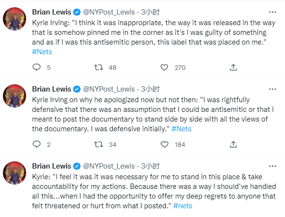 此前欧文因在社交媒体上发布反犹太的电影链接而引起轩然大波,欧文因两次拒绝道歉而被篮网禁赛,之后欧文多次公开道歉,今天解禁复出,欧文再度道歉,接受了长达13分钟的采访,篮网总经理肖恩-马克斯和NBPA总裁都在现场。