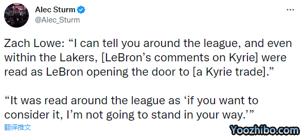 对此,名记扎克-洛维表示:我不知道为什么勒布朗昨天那么说欧文,他说是时候让欧文重回联盟了。也许他这么说只是因为他就是那么想的,没有别的含义。我可以告诉你,在整个联盟,甚至在湖人内部,这些评论被解读为勒布朗打开了一扇门,至少打开了一扇门,‘嘿,如果你们都愿意接受这样做,以及接受它会带来的所有负面影响,篮网现在愿意接受抛售欧文的生意,这样我们就可以以更低的价格得到他,不是付出两个选秀权,也许是一个选秀权;这被全联盟解读为勒布朗在暗示,‘如果你们想考虑一下欧文的交易,我不会阻挡你们的。