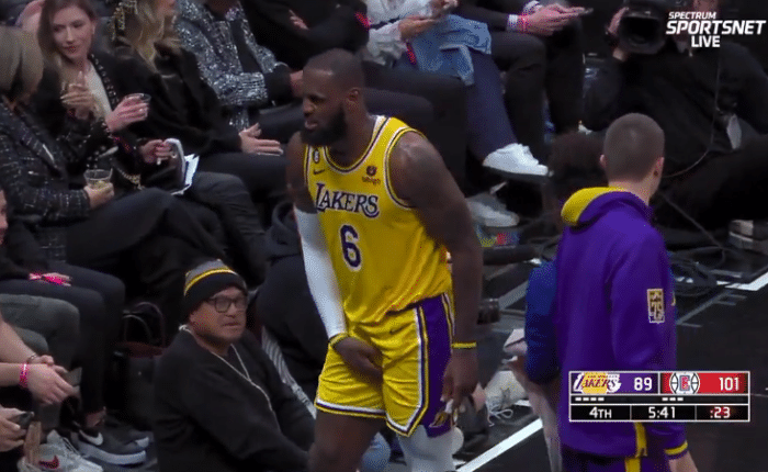 在湖人对阵快船第四节5分41秒,詹姆斯捂着腹股沟痛苦离场,接受检查后湖人宣布老詹因腿部酸痛退出比赛;赛后詹姆斯承认腹股沟受伤,但伤势没有上次那么严重。
