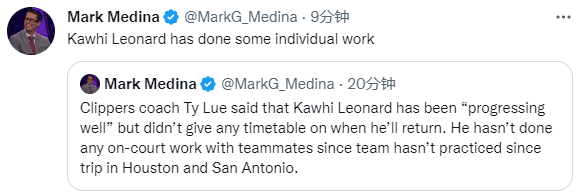 据名记Mark Medina报道,快船主帅泰伦卢表示小卡伤势恢复良好,已经完成了一些个人训练;但卢帅透露小卡没有具体复出时间表,小卡还没有和队友合练;球丢正在遵循医疗团队的意见。