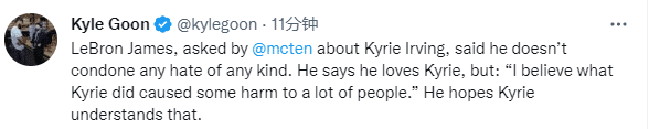 詹姆斯回应欧文禁赛事件:欧文伤害了很多人 我不容忍任何形式的仇恨