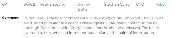 勇士和热火终场前1分40秒,场上发生争议吹罚,究竟巴特勒有没有对库里犯规?裁判报告显示巴特勒未犯规,解释:最后1分40秒,巴特勒封盖库里三分被吹犯规,但由于巴特勒是在触球后与库里击掌,教练挑战下,裁判推翻了犯规的判罚,而在比赛被打断时热火即将控制球权,所以球被判给了热火。