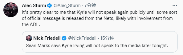 此前欧文因疑似支持一部反犹太电影而受到质疑和批评,篮网官方强烈谴责以及蔡崇信公开表达不满,虽然欧文已经删除动态,但外界仍呼吁篮网惩罚欧文;目前来看,在篮网处罚欧文之前,欧文应该都不会接受采访了。