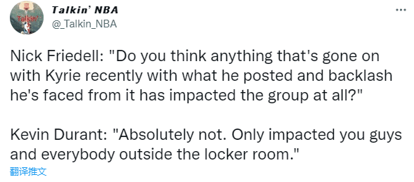 赛后记者问欧文的场外风波是否影响了球队,杜兰特表示:绝对没有,仅仅影响了你和更衣室外的家伙们;杜兰特拒绝透露他们在更衣室中讨论的事情。