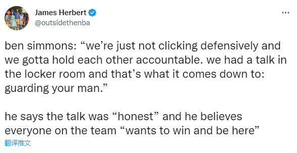 篮网输球赛后,众球员在更衣室召开了仅限球员参加的内部会议,西蒙斯透露会议主要内容是关于防守的,他表示:我们没有打好防守,必须每个人都去做好防守,我们更衣室会议讨论的内容可以归结为“防好你的人”。