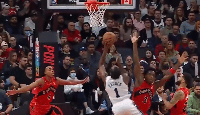 第三节,哈登突破遇到阿奴诺比的协防,直接抛投再度打成2+1。哈登空位三分球出手不中,还被阿奴诺比抢断反击暴扣。猛龙疯狂追分,哈登背传侧翼梅尔顿,助攻队友命中三分球。