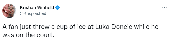 末节杜兰特执行罚球时,坐在看台上的球迷被东契奇打怒了,居然向球场内扔了一大块冰块,冰块落在东契奇附近,卢卡吓了一大跳;现场的工作人员赶紧上场清理地板,比赛因此推迟了很久;所幸冰块没有砸到东契奇,也算是逃过一劫。
