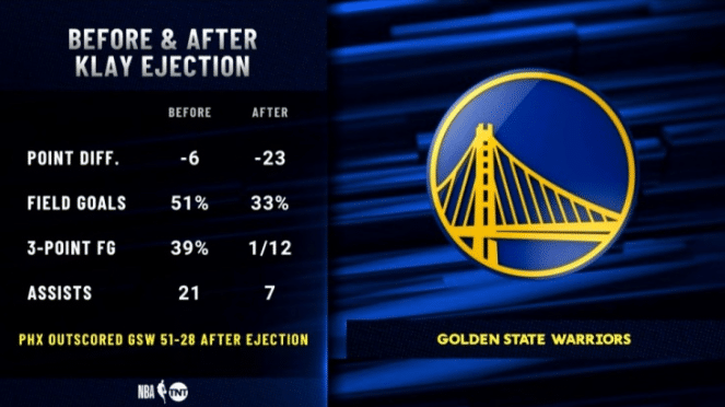 值得一提的是,这场比赛克莱在第三节中段被驱逐,他先是和布克纠缠,暂停的时候和对手冲突,被裁判出示技术犯规。之后克莱朝着裁判表达不满,再度吃到技术犯规,被直接驱逐。克莱被驱逐之后,勇士的表现很糟糕,被太阳打了波51-28,净负23分,三分球只有尴尬的12中1,表现很差。
