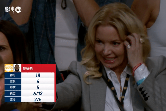 下半场,湖人和快船第三节僵持对战,期间浓眉重摔倒地太惊险,所幸身体无碍可湖人全队突然不得分,被快船打出17-0的攻击波,湖人瞬间落后到两位数;安德森轰进三分为湖人打破僵局,湖人再次追分,詹姆斯造犯规两罚全中,钉板大帽鲍威尔,老詹一条龙暴扣,湖人美女老板珍妮-巴斯开心庆祝,三节打完湖人落后8分。