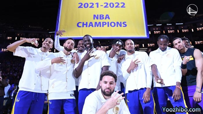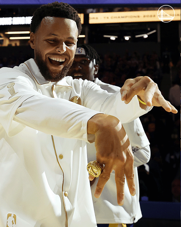 赛前,勇士全队正式领取总冠军戒指,库里最后一个上场领取戒指,并且喊话倒计时,升起总冠军旗帜;勇士冠军戒指上镶满钻石,领取戒指的库里乐开怀,大秀钻戒疯狂庆祝。