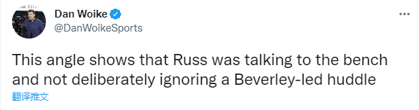 威少还说在拥挤的情况下被麦克丹尼尔斯打成2+1是他和裁判、教练交流的原因;贝弗利示意开会时现场另一镜头曝光,当时威少确实不满判罚,冲着替补席上的教练组喊话,这是威少当时做的事,也是他不搭理贝弗利的原因,湖人记者Dan Woike发推写道:这个角度表明,威少是在和替补席交谈,而不是故意无视贝弗利的召唤。