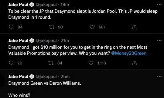 网红拳手约架格林,杰克-保罗发推写道:(拳击赛)追梦VS德隆,谁能赢?追梦你给我上拳击台,我给你1000万美金,你想打谁?说白了,追梦击倒的JP(Jordan Poole)是普尔,而我一轮就会击倒追梦。