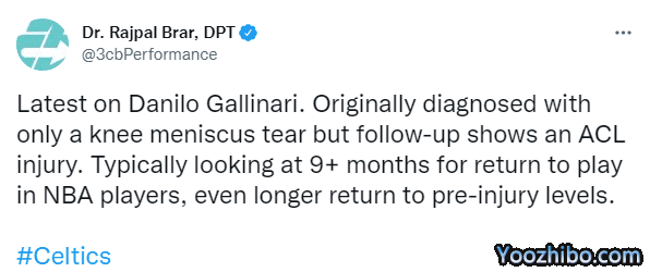 医学专家Rajpal brar表示,加里纳利的伤情最初仅诊断为膝半月板撕裂,可之后确诊是十字韧带撕裂。通常情况下,NBA球员需要9个多月才能重返赛场,甚至需要更长时间才能恢复到受伤前的水平。