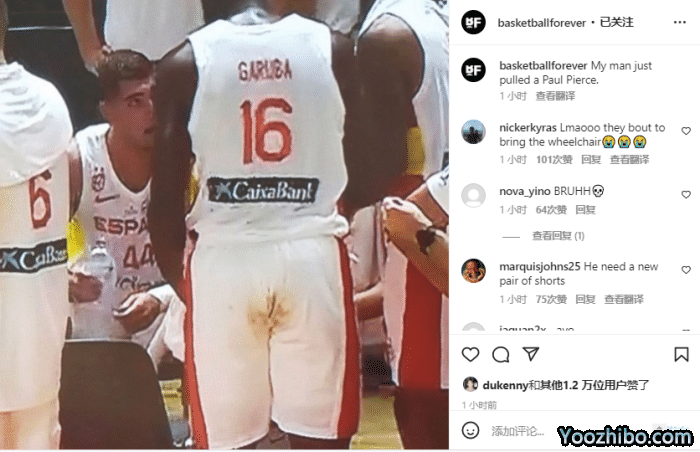 24直播网08月28日讯 ,男篮世预赛西班牙86-64大胜荷兰,火箭球员加鲁巴在赛场上拉稀拉裤裆一幕引热议,裆部的黄色在白色球裤上非常显眼;皮尔斯、哈登也曾遭遇如此尴尬的事情。