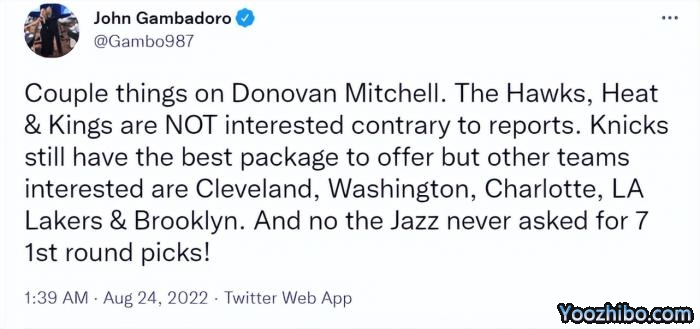 NBA记者John Gambadoro报道,关于米切尔交易的最好报价,仍然是尼克斯所提供的,骑士、奇才、黄蜂、湖人和篮网也都表达出了对米切尔的兴趣,而老鹰、热火和国王已经不想竞争米切尔了。该记者还提到,关于米切尔的交易,爵士从未提过7个首轮的要价。此前有报道称,爵士想要得到7个首轮(包括4个无保护的首轮)。