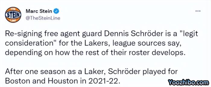 除了爵士三人之外,湖人还有兴趣签回旧将施罗德。施罗德此前拒绝续约湖人后,与凯尔特人签约中产,并被交易到火箭。如今他依然是一名自由球员。名记斯坦恩报道称,消息人士透露,湖人正在考虑签回施罗德,最终是否会签下他将取决于球队阵容接下来的发展情况。而记者萨姆-阿米克报道称,除了湖人,爵士和独行侠也对施罗德有兴趣。