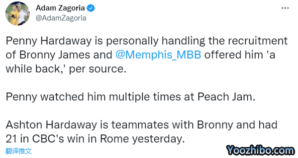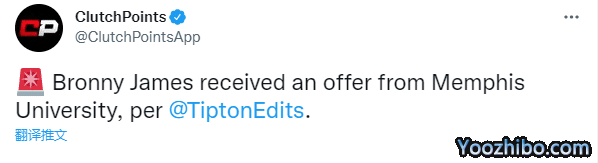 24直播网08月20日讯,据美记者JoeTipson报道,詹姆斯的大儿子布朗尼已经收到孟菲斯大学的offer邀请函,该大学是德里克-罗斯、NBA名宿哈达威以及今年13号秀杰伦-杜伦等人的母校;其中“便士”哈达威是孟菲斯大学的现任主教练,他正在积极招募布朗尼。