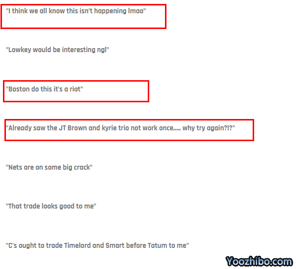 有球迷表示,波士顿若这么做会引起一场骚乱。还有球迷表示,已经看到塔图姆、布朗和欧文的组合在绿军不起作用,篮网为啥还要再试一次?