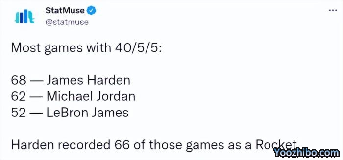 数据网站StatMuse写道:“史上40+5+5场数最多的三名球员,分别是哈登(68场)、乔丹(62场)和詹姆斯(52场)”,哈登其中66场40+5+5来自效力火箭期间。现在,哈登已经有所转型,不需要再得那么多分数,新赛季我们会看到一个怎样的他呢?
