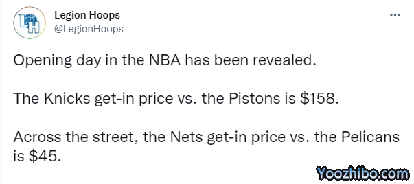 据美媒Legion Hoops报道,尼克斯新赛季揭幕战对阵活塞的门票是158美元,篮网揭幕战对阵鹈鹕的门票是45美元。