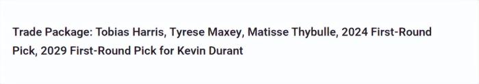 24直播网08月16日讯 杜兰特辟谣退役传闻,KD的闹剧仍在继续。北京时间8月16日,美媒Fadeaway World晒出了一笔关于杜兰特的新交易方案,具体内容是篮网送出杜兰特,得到76人的托比亚斯-哈里斯、马克西、塞布尔、2024年首轮签和2029年首轮签。(注:此前有报道称,76人唯一能交易的首轮是2029年首轮,若满足这笔方案,76人还得先通过交易得到一个首轮)