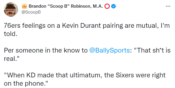 据美记Brandon Robinson报道,杜兰特与76人相互有意,他表示:据知情人士透露,杜兰特与76人相互有意,这件事是真的。当杜兰特向篮网下达最后通牒时,76人就在打电话。
