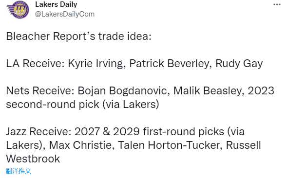 湖人得到欧文、贝弗利和鲁迪-盖伊;篮网得到博扬-博格丹诺维奇、马利克-比斯利和2-23年次轮选秀权;爵士得到威少、霍顿-塔克、马克斯-克里斯蒂、霍顿-塔克和2027年首轮签、2029年首轮签。