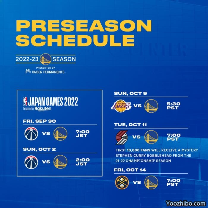 勇士官方公布了球队新赛季季前赛的赛程,具体赛程是9月30日下午3点对阵奇才(日本赛)、10月2日早上10点 对阵奇才(日本赛)、10月10日早上5点半主场迎战湖人、10月12日早上7点 主场迎战开拓者和10月15日早上7点 主场迎战掘金。