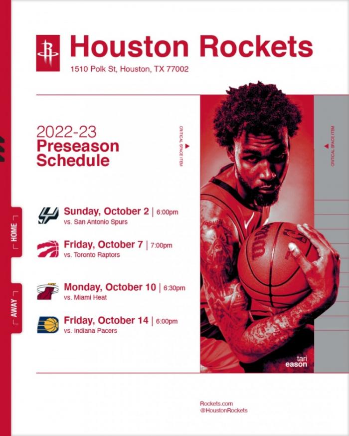 火箭官方公布了新赛季季前赛的赛程,具体如下: