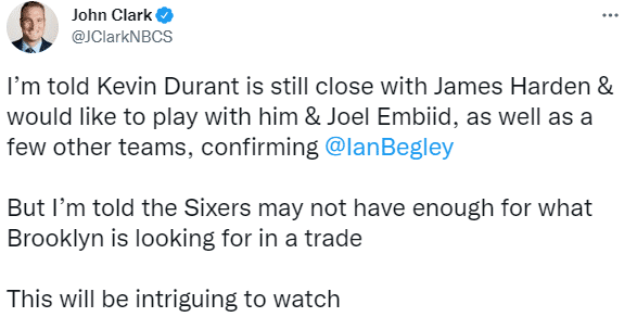 据费城记者John Clark报道了,杜兰特和哈登的关系十分密切,KD想要和哈登、恩比德一起打球,还有其他几支球队;但费城可能没有足够的筹码来满足布鲁克林,这将会很有趣。