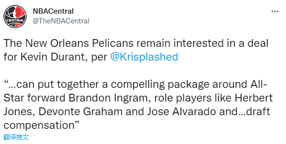 杜兰特被篮网交易的最新赔率显示,被交易离队赔率是3/2,留队赔率是1/2;杜兰特离队概率增加,据篮网记者Kristian Winfield报道,鹈鹕仍然对杜兰特的交易很感兴趣,鹈鹕可打包英格拉姆、赫伯特-琼斯、格拉汉姆以及阿尔瓦拉多组合一个有吸引力的报价。