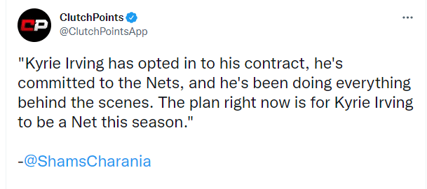 名记Shams表示:归根结底,无论杜兰特是否申请交易或是被交易走,作为杜兰特的好友,欧文会支持他的选择。而作为球员来说,欧文选择了执行球员选项,他坚定地选择了篮网,欧文在幕后完成了一切,所以我坚信,(篮网)现在的计划是让欧文作为篮网新赛季的一员。
