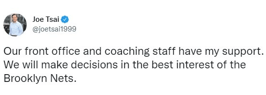 很快杜兰特不满管理层的原因被曝光,和他关系极好的助教范特普尔和哈林顿离队,同时好友欧文的续约合同问题让杜兰特不满马克斯,他支持欧文。现在蔡崇信的终结选择来啦,他在社交媒体上表达态度,称:“我支持我们的管理层和教练组,我们会做出对篮网而言最好的决定。”