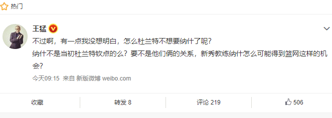 包括王猛也质疑杜兰特,称:不过啊,有一点我没想明白,怎么杜兰特不想要纳什了呢?纳什不是当初杜兰特钦点的么?要不是他们俩的关系,新秀教练纳什怎么可能得到篮网这样的机会?