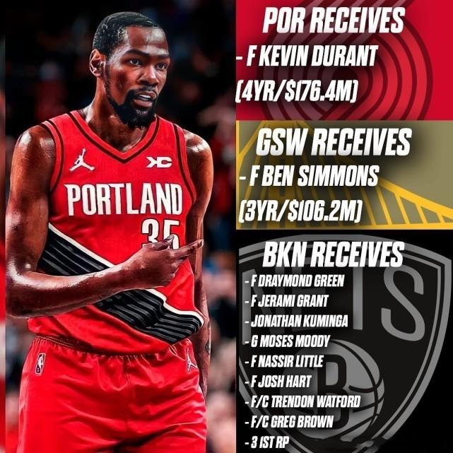 篮网得到:追梦-格林、杰拉米-格兰特、库明加、穆迪、利特尔、哈特、沃特福德、格雷格-布朗以及3个首轮签