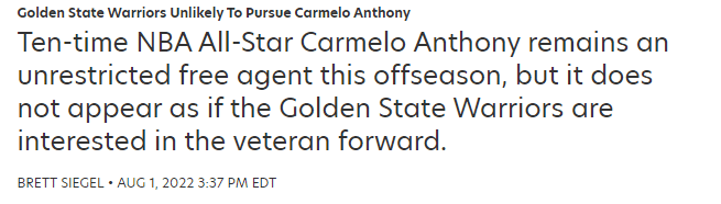 曝勇士无意安东尼!甜瓜很可能1年底薪重返湖人 或终生无缘夺冠