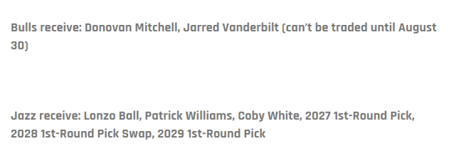 方案具体内容是公牛送出球哥、帕特里克-威廉姆斯、科比-怀特、2027年首轮签、2029年首轮签和2028年首轮互换权,得到爵士的米切尔和范德比尔特。值得一提的是范德比尔特要到8月30日以后才可以被交易。