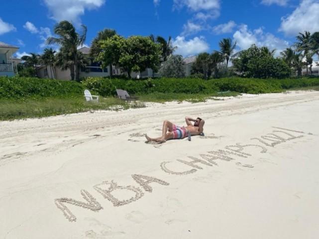 克莱晒日光浴也整活!沙滩写上2022年总冠军 为勇士队友安排位置