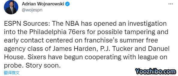来源:24直播网07-30 10:2724直播网讯 北京时间7月30日,据ESPN名记沃纳罗斯基报道,NBA已经开启一项调查,调查76人是否存在违规招募和(早于自由球员市场开启时间的)提前接触,主要集中在哈登、塔克和豪斯三名球员,76人正配合联盟的调查,或因违规招募被联盟重罚。
