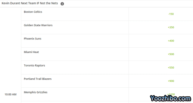 若杜兰特离开篮网的最新下家赔率是:1. 绿军(-150)、2.勇士(+350)、3.太阳(+400)、4.热火(+500)、5.猛龙(+550)、6.开拓者(+900)、7.灰熊(+1200)、7.快船(+1200)、9.尼克斯(+1600)、9.老鹰(+1600)、11.湖人(+1800)、12.雷霆(+2200)、12.公牛(+2200)。
