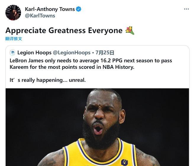 对于詹姆斯新赛季冲击历史得分王,森林狼球星唐斯转发美媒推文并且发推写道:欣赏每个人的伟大。