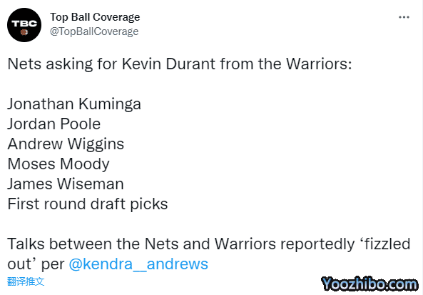 来源:24直播网07-23 15:1624直播网07月23日讯 ,杜兰特交易处于搁置的状态,由于篮网要价太高,勇士与他们谈判失败;据NBA记者Kendra Andrews透露,篮网向勇士要价库明加、普尔、维金斯、穆迪、怀斯曼和一个首轮选秀权,篮网索要杜兰特1换6被勇士拒绝,双方交易已经谈崩。