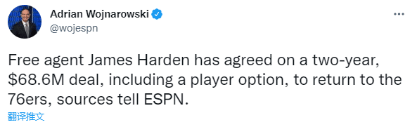 2年6860万美元!哈登正式与76人续约 继续联手恩比德冲击总冠军