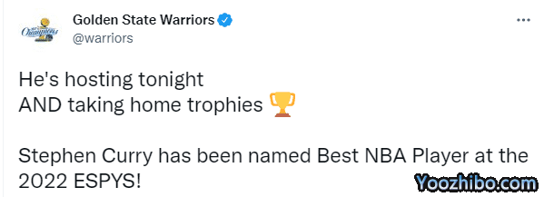 来源:24直播网07-21 10:1024直播网07月21日讯 ,ESPY年度最佳NBA球员大奖正式出炉,库里不仅支持ESPY颁奖典礼,而且夺得NBA年度最佳,力压东契奇、恩比德和约基奇又添一项大奖;勇士官方第一时间恭喜库里获奖。