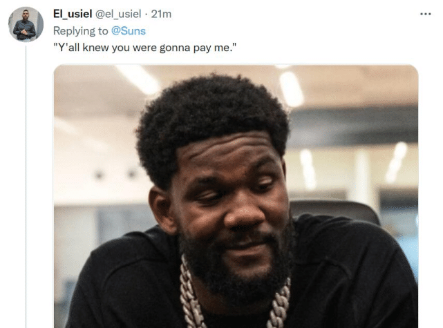 也有球迷晒出艾顿签约时的表情,配文调侃内心活动:“你们都知道你们得给我钱!”此前,太阳一直不愿意给艾顿顶薪,但当步行者顶薪报价艾顿后,他们也不得不匹配报价,因为他们不愿意竹篮打水一场空,白白损失一位状元中锋。