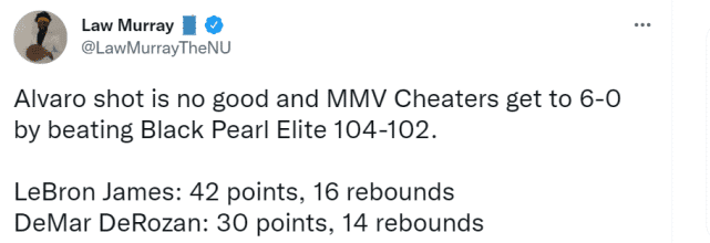 虽然是半职业联赛,但德罗赞和老詹也不是完全砍瓜切菜,詹姆斯曾被对手晃过,德罗赞也被抢断。两人合砍72分,锁定胜局。