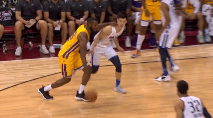 第二节8分多钟,郭昊文在防守时和湖人球员维托-布朗缠在一起,两人的手臂缠在一起,之后布朗一拳打到郭昊文的面部,当时裁判吹罚郭昊文防守犯规,不过对于布朗的不必要动作,裁判回放后吹罚布朗一级恶意犯规,被吹恶犯后布朗苦笑以及一脸郁闷。