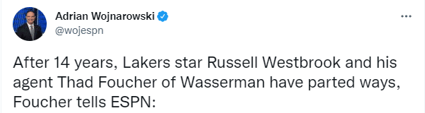 据名记Woj报道,威少合作14年的经纪人Thad Foucher透露他已经和威少分道扬镳;Foucher表示他和威少存在不可调节的分歧,并暗示这个分歧是威少是否应该在合同最后一年继续留在湖人;Foucher方面相信留在湖人是威少最好的选择,因为新帅哈姆已经公开表示将提供首发角色以及支持。