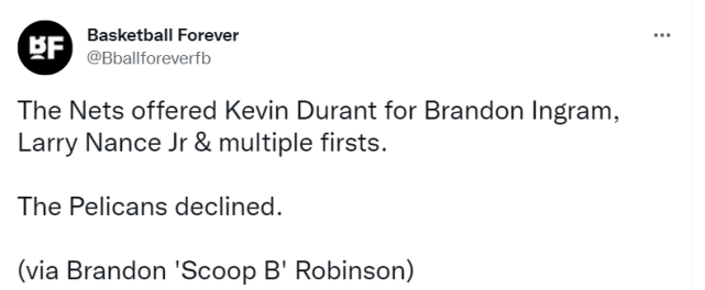 此前报道称,鹈鹕一直不愿意送走英格拉姆,而且他们想要围绕锡安和莺歌来建队,对杜兰特兴趣不大。篮网的要求,鹈鹕直接拒绝了。这似乎也暗示着着篮网想通过交易杜兰特得到的那些回报,几乎没有球队能够满足。